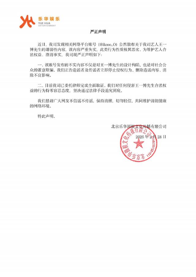 2月28日,@乐华娱乐 发声明回应,称内容严重失实,要求删除造谣内容,并且已委托律师完成全面取证,将依法追究到底。