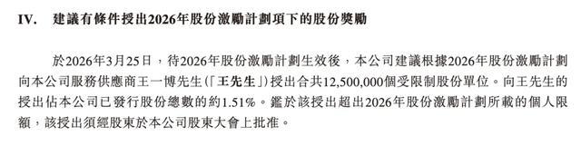 当日,乐华娱乐董事会审议及议决批准建议采纳2026年股份激励计划。乐华娱乐建议有条件授出2026年股份激励计划项下的股份奖励,建议向王一博授出1250万个受限制股份单位,认购价每股0.01港元,占已发行股份约1.51%,相关激励需待股东特别大会审议通过后方可生效。