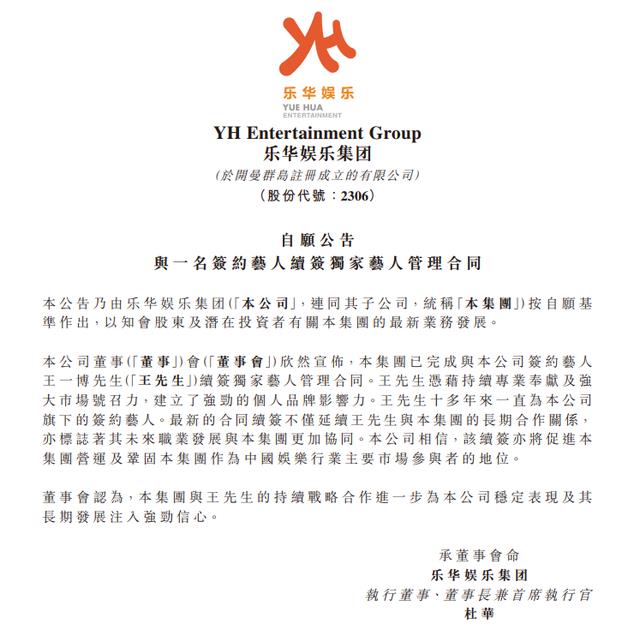 公告中称,“本集团已完成与本公司签约艺人王一博先生(王先生)续签独家艺人管理合同。王先生凭借持续专业奉献及强大市场号召力,建立了强劲的个人品牌影响力。王先生十多年来一直为本公司旗下的签约艺人。最新的合同续签不仅延续王先生与本集团的长期合作关系,亦标志着其未来职业发展与本集团更加协同。”