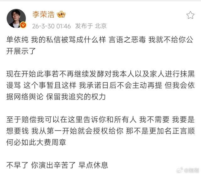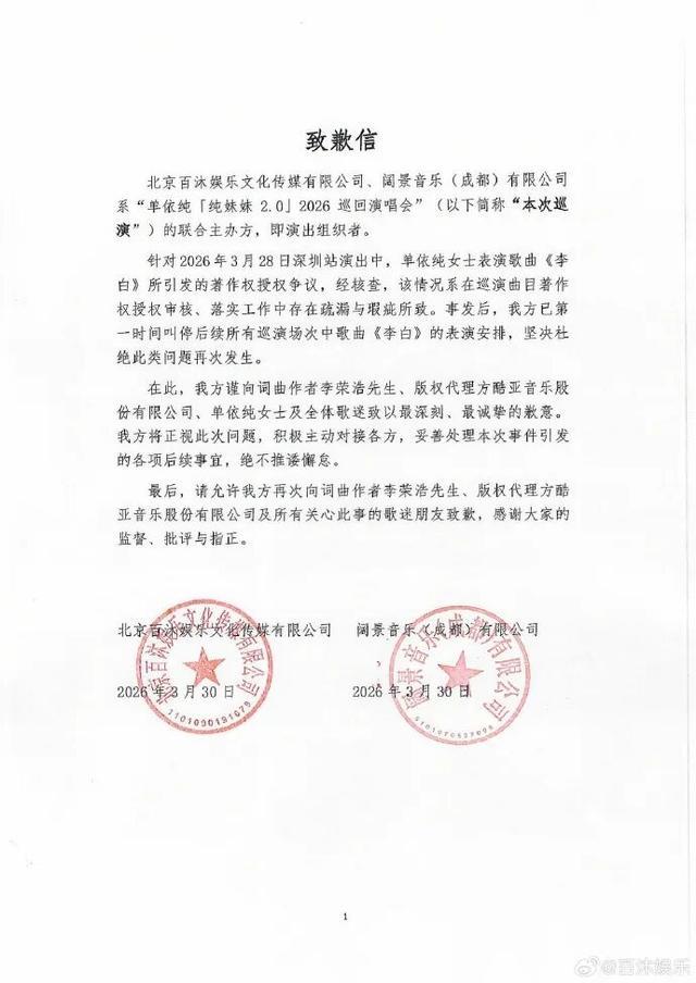 3月30日凌晨,@单依纯 再次发文:今天,我必须怀着万分愧疚和自责的心情,向所有人郑重道歉——昨天的演唱会中,在实际未获得书面授权的情况下,我演唱了《李白》这首歌,给李荣浩老师带来了伤害,辜负了大家的信任,我在此向所有受影响的朋友致以最诚挚的歉意。