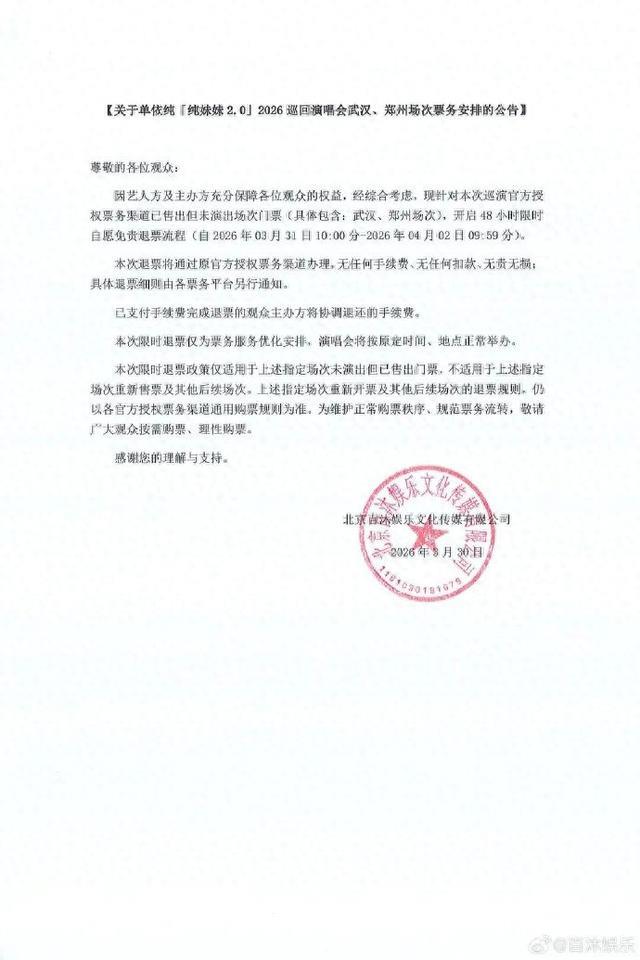 3月30日晚,百沐娱乐发布关于单依纯「纯妹妹2.0」2026巡回演唱会武汉、郑州场次票务安排的公告:因艺人方及主办方充分保障各位观众的权益,经综合考虑,现针对本次巡演官方授权票务渠道已售出但未演出场次门票(具体包含:武汉、郑州场次),开启48小时限时自愿免责退票流程。本次限时退票仅为票务服务优化安排,演唱会将按原定时间、地点正常举办。