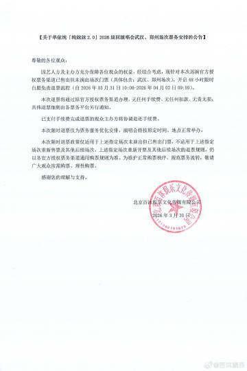 3月30日晚,@百沐娱乐发布关于单依纯「纯妹妹2.0」2026巡回演唱会武汉、郑州场次票务安排的公告:因艺人方及主办方充分保障各位观众的权益,经综合考虑,现针对本次巡演官方授权票务渠道已售出但未演出场次门票(具体包含:武汉、郑州场次),开启48小时限时自愿免责退票流程。本次限时退票仅为票务服务优化安排,演唱会将按原定时间、地点正常举办。