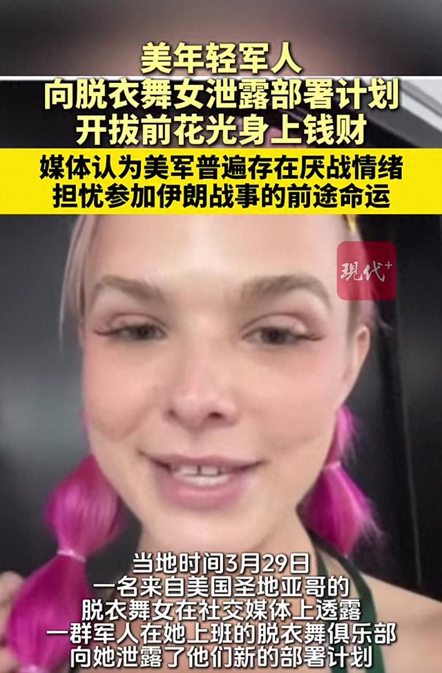 当地时间3月29日,一名来自美国圣地亚哥的脱衣舞女在社交媒体上透露,一群军人在她上班的脱衣舞俱乐部向她泄露了他们新的部署计划。