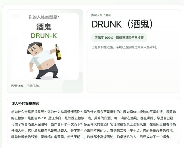 当选择B选项时,最终将得到“DRUNK(酒鬼)”,并解释为“乙醇亲和性过强,系统已直接跳过常规人格审判。”根据测试制作者发布的视频,该测试设计的初衷,就是为了劝诫一位爱喝酒的朋友戒酒,而这位朋友就有将白酒灌在保温杯的习惯。