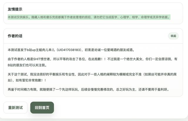 制作者友情提示称“本测试仅供娱乐,隐藏人格和傻乐兜底都属于作者故意埋的损招,请勿把它当成医学、心理学、相学、命理学或灵异学依据。”此外,制作者表示:“关于这个测试,我没法很好的平衡娱乐和专业性,因此对于一些人格的阐释较为模糊或完全不准(如屌丝可能并非真的屌丝),如有冒犯非常抱歉!”