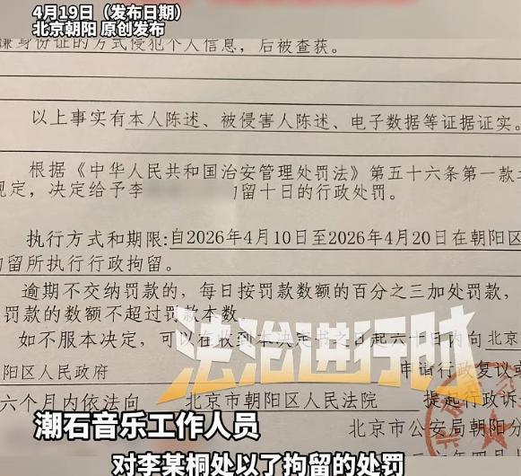4月19日,据法治进行时报道,李某桐泄露薛之谦手机号、身份证号,被北京朝阳分局依法行政拘留。